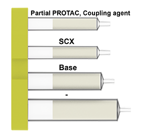 The cartridge contains all reagents for the linking the carbonyl group of a protein binder with the partial PROTAC and components for the purification steps of the process.
